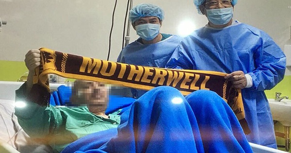 Bệnh nhân giơ cao chiếc khăn có chữ "Motherwell" khi chụp ảnh cùng PGS.TS Lương Ngọc Khu. Bệnh nhân nói lời cảm ơn các y bác sĩ Việt Nam đã tận tình cứu chữa. Ảnh: BVCC.