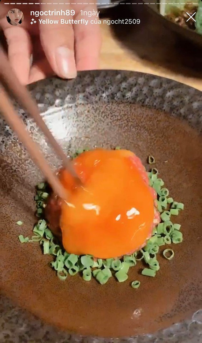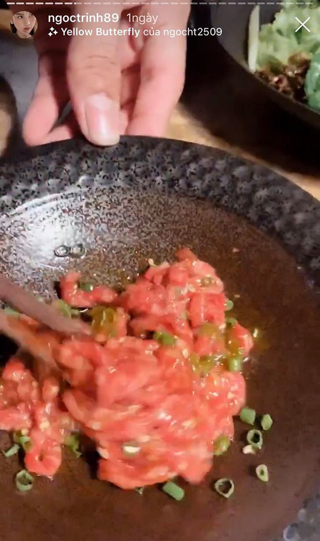 Ngọc Trinh rất thích món gỏi thịt bò sống, liên tục đăng story về món ăn này. Thậm chí sau một ngày còn… đăng lại trên Instagram story thêm lần nữa. (Ảnh chụp màn hình).