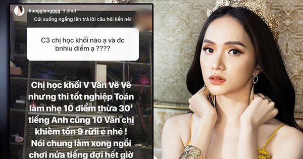 Mới đây, trên Instagram cá nhân, Hương Giang gây chú ý khi khoe khéo học lực của mình. Theo đó, khi có fan hỏi về bảng điểm tốt nghiệp cấp 3, nàng hậu trả lời: "Chị học khối V Văn - Vẽ - Vẽ nhưng thi tốt nghiệp Toán làm nhẹ 10 điểm thừa 30 phút, tiếng Anh cũng 10, Văn chị khiêm tốn 9 rưỡi em nhé! Nói chung làm xong ngồi chơi nửa tiếng đợi hết giờ ý. Giờ thì quên hết rồi".