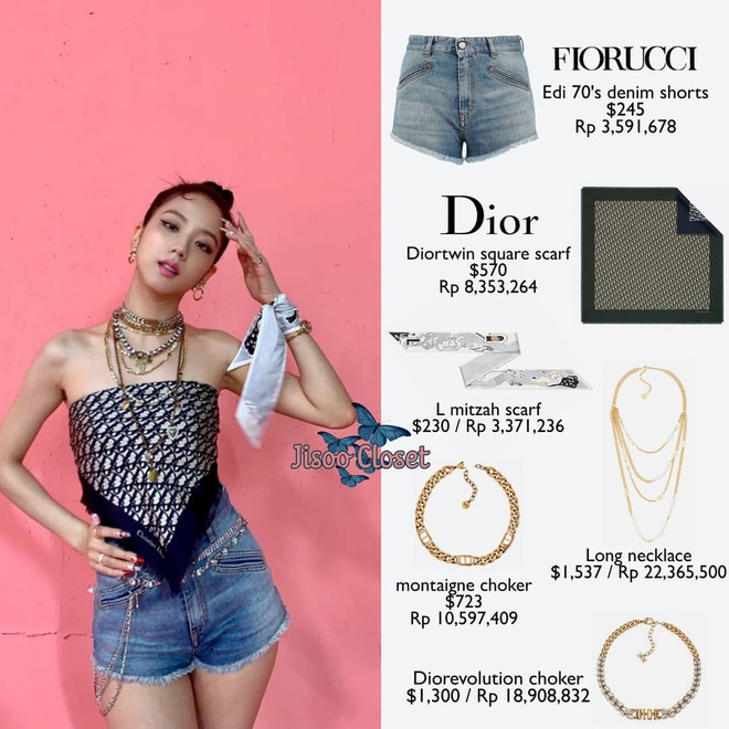 Thấp hơn bộ bên trên một tẹo nhưng cũng đủ để khiến bạn choáng váng là set đồ trong phân cảnh đi xe đạp 3 bánh của Jisoo. Khoảng 1,1 tỷ đồng là giá của tất cả các sản phẩm đang được liệt kê.