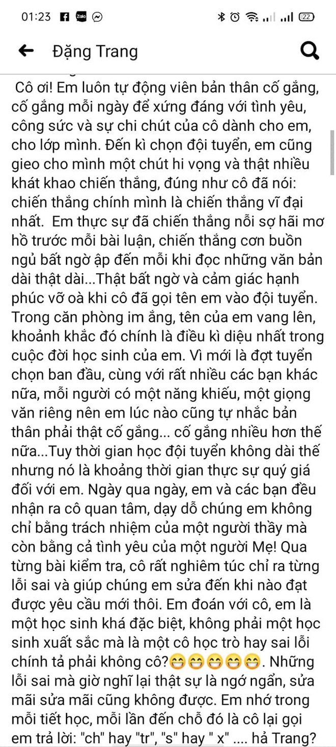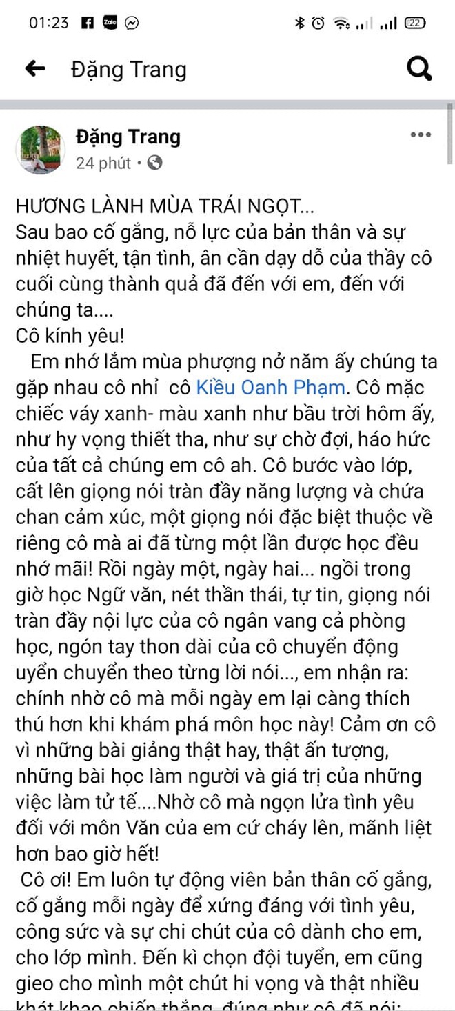 Cô Kiều Oanh chia sẻ: "Trang là một học sinh học Văn có kết hợp nhiều yếu tố, một là có tư duy để có một bài văn mạch lạc, thứ hai là bạn có cảm xúc để khiến cho bài văn có chất riêng và là một trong những học sinh mà mình cho là hiếm có trong đời dạy học của mình. Thứ ba là bạn ấy cũng rất là cần cù và thông minh, tuy có năng khiếu trời phú nhưng không ngừng rèn luyện."