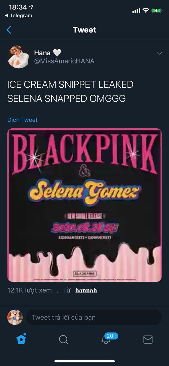 Cách đây ít phút, cộng đồng người hâm mộ BLACKPINK và Selena Gomez trên toàn thế giới không khỏi xôn xao khi 10 giây từ ca khúc Ice Cream bất ngờ phát tán trên MXH Twitter. Đoạn clip này được cho là do chính Selena Gomez bật trong show dạy nấu ăn Selena Plus Chef chuẩn bị lên sóng của cô trong ngày hôm nay, như một cách để "nhá hàng" cho ca khúc Ice Cream.