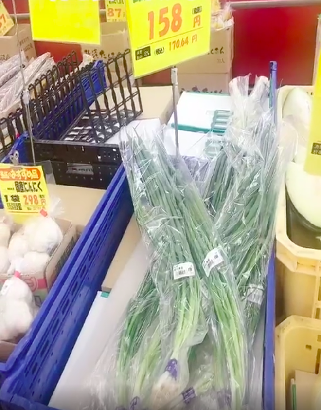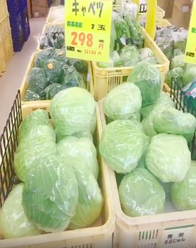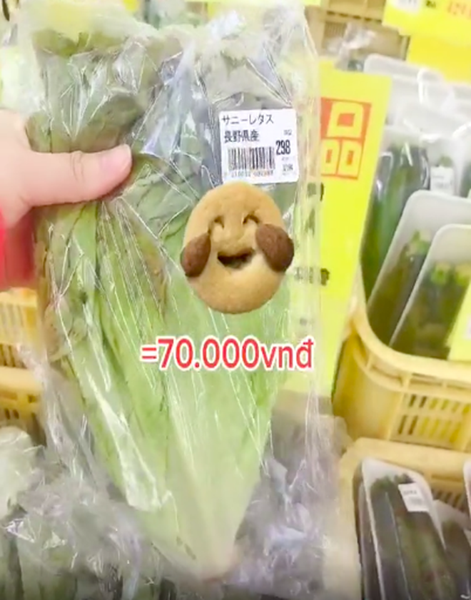 Chỉ trong một đoạn clip ngắn, cô gái này đã tiết lộ hàng loạt mức giá rau củ quả "gây sốc" trong một siêu thị Nhật: Hành lá (35.000 đồng/bó), bắp cải (65.000 đồng/cái), rau xà lách (70.000 đồng/bó), dưa lưới (762.000 đồng/quả), dưa hấu (390.000 đồng/quả)…