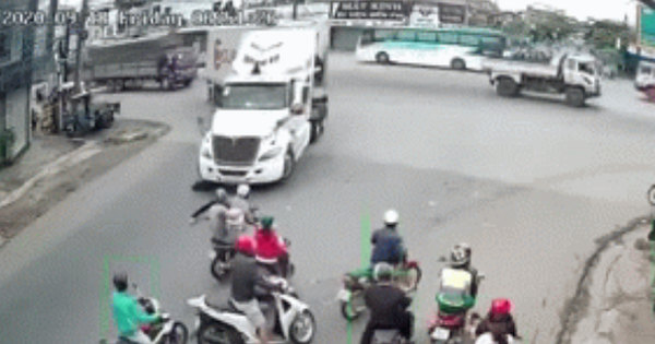 Theo đó, đoạn clip được trích xuất từ camera giám sát tại khu vực ngã tư cho thấy cảnh một chiếc container (màu trắng) từ đường lớn đang chầm chậm đánh lái để rẽ phải. Đúng lúc này, một nam thanh niên điều khiển xe máy lưu thông cùng chiều đã cố gắng tăng tốc để tạt đầu vượt lên.