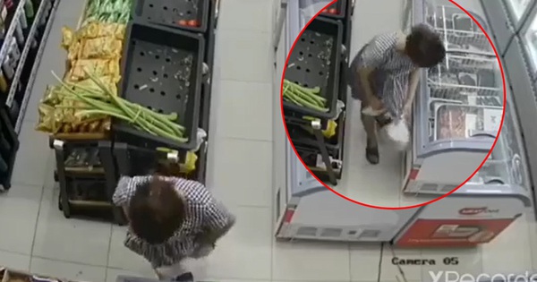 Theo đó, đoạn clip được trích xuất từ camera an ninh của siêu thị hiển thị thời gian ngày 2/9/2020. Thời điểm này, một người phụ nữ đeo khẩu trang, mặc váy rộng đứng lựa đồ tại gian hàng đông lạnh, mở tủ mát để lấy 2 gói đồ (được cho biết là tôm sú).