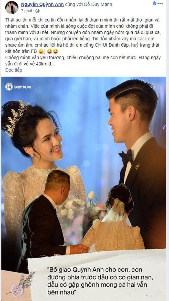 2. Quỳnh Anh đăng status bóng gió khiến Duy Mạnh vướng vào nghi vấn bạo hành vợ dù chỉ là đồn thổi