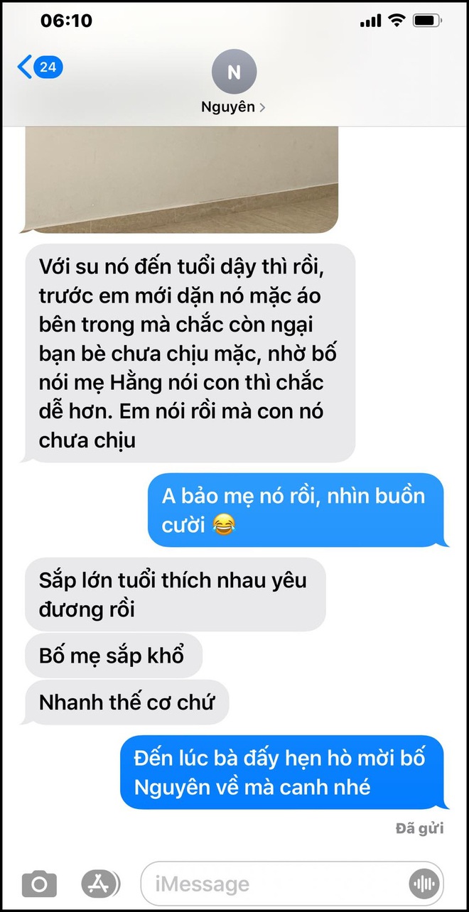 Đặc biệt, kèm theo chia sẻ này, Hằng Túi còn đăng luôn cả đoạn tin nhắn của Tiến Dũng với chồng cũ và với mẹ chồng cũ. Không khó để nhận thấy mối quan hệ cực kì tốt đẹp của 2 bên hiện tại, Tiến Dũng dành rất nhiều thời gian cho Su và Sóc (con của Hằng Túi và Đăng Nguyên) còn Đăng Nguyên lại hớn hở khoe được Sữa và Sam (con của Hằng Túi và Tiến Dũng) thơm má tạm biệt trước khi về.