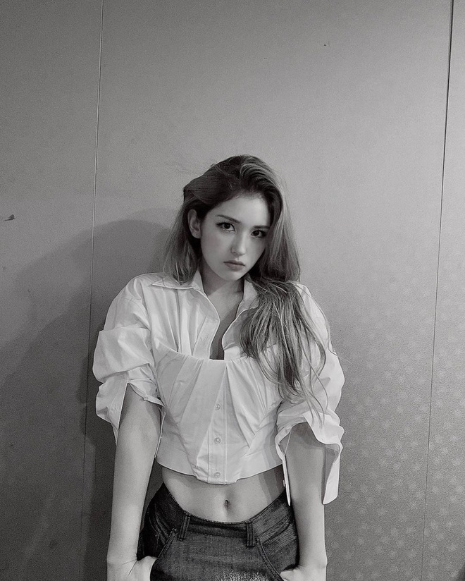 Nhưng bất ngờ nhất phải là "bông hồng lai" Somi khi mix áo cùng chân váy jeans trẻ trung. Cô nàng còn có lối tạo dáng thông minh khi giơ cao phần tay, tôn lên vòng eo thon thả.