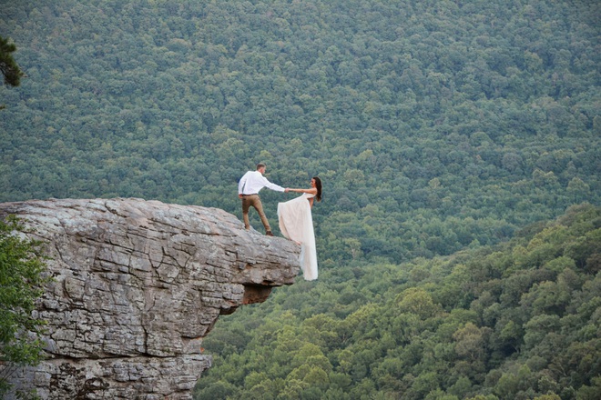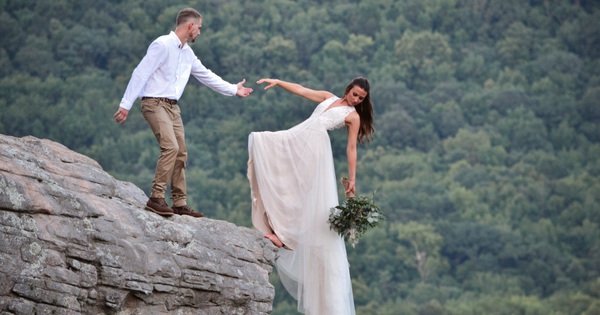 Họ nhờ nhiếp ảnh gia cũng có mặt tại đó chụp lại khoảnh khắc đầy ngoạn mục khi cô dâu chú rể nắm tay nhau đứng ở mép vực núi hết sức nguy hiểm. Đặc biệt, bức ảnh cô dâu chới với ngã người như sắp rớt xuống đỉnh núi cao hơn 500m còn chú rể thì với tay ra như muốn cứu sống vợ mình khiến nhiều người không khỏi thót tim khi nhìn thấy.