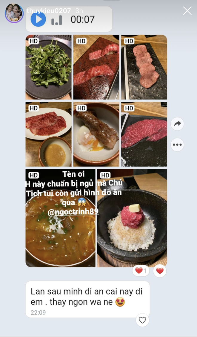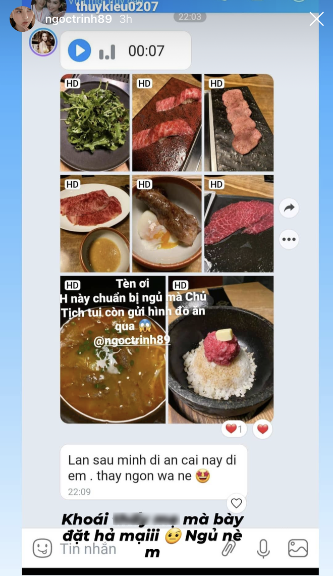 Khoản ăn uống, Thuý Kiều cũng thường xuyên được Ngọc Trinh rủ đi ăn đồ xịn ở nhà hàng cao cấp. Không chỉ gửi những món ăn ngon, Ngọc Trinh còn nhắn cực kì thân thiết như "rủ" một người em đi ăn: "Lần sau mình đi ăn cái này đi em. Thấy ngon quá nè".