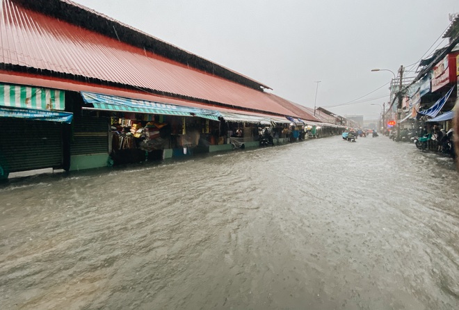 Các tuyến đường xung quanh chợ Thủ Đức biến thành sông, giao thông "tê liệt". Các tiểu thương vật lộn tìm cách ngăn không cho nước tràn vào sâu