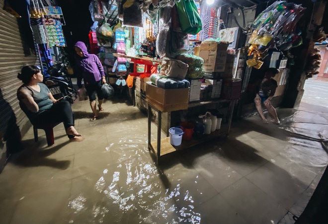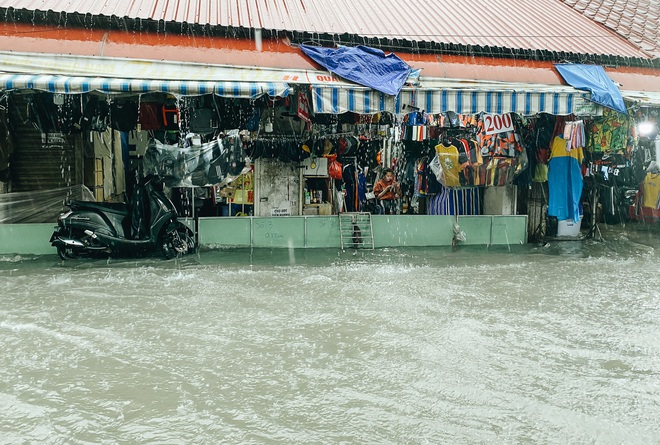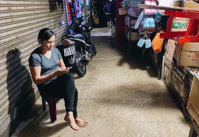 Ngoài đường ngập, bên trong chợ Thủ Đức cũng ngập khá nặng khiến mọi hoạt động buôn bán bị ngưng trệ