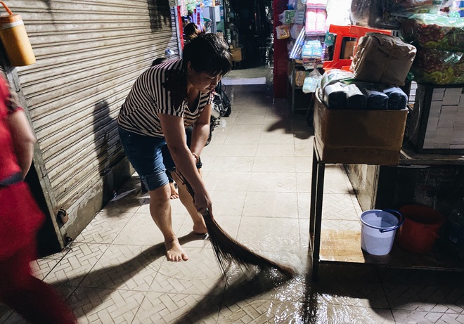 Đến 17h cùng ngày, nước mới bắt đầu rút dần, lúc này tiểu thương mới bắt đầu dọn dẹp rác thải theo nước từ ngoài vào chợ. Thời điểm này, nước trên các tuyến đường quanh chợ Thủ Đức mới bắt đầu rút dần.