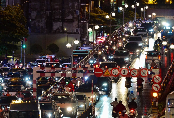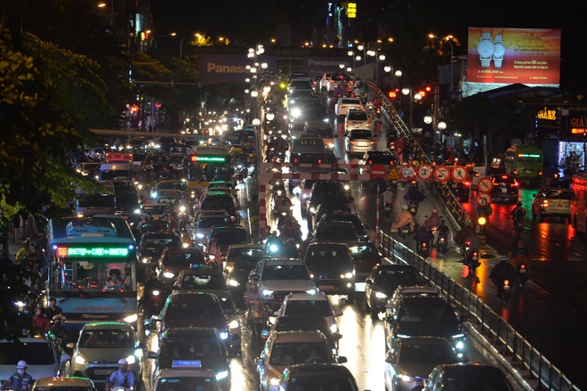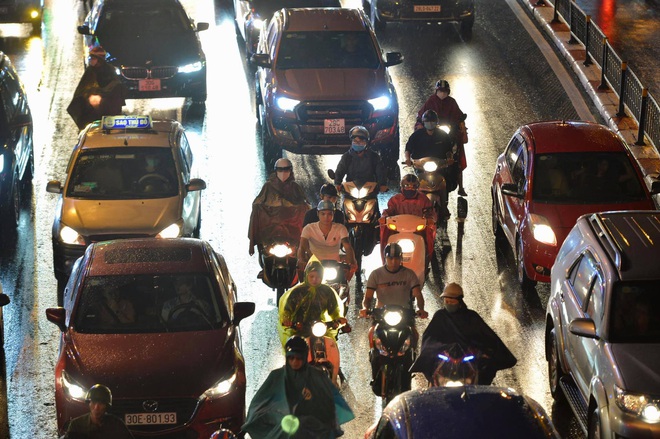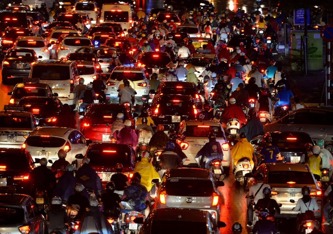 Cơn mưa trắng trời đúng giờ cao điểm tan tầm khiến nhiều tuyến phố thủ đô ùn tắc kinh hoàng. Đến 18h30 phút, lưu lượng phương tiên trên đường Nguyên Trãi (Thanh Xuân, Hà Nội) vẫn rất đông đúc. Dòng phương tiện nhích từng cm, chấp nhận chôn chân dưới mưa hàng tiếng đồng hồ, thậm chí là nhiều người đi lên vỉa hè để thoát ùn tắc.