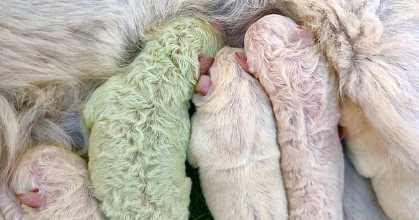 Theo tờ Daily Mail, chó của một bác nông dân ở Ý vừa sinh được 5 bé cún và một trong số đó có bộ lông màu xanh lá cực kỳ lạ mắt. Được biết, đây là một biểu hiện của một biến đổi sắc tố vô cùng hiếm từ trong bụng mẹ.