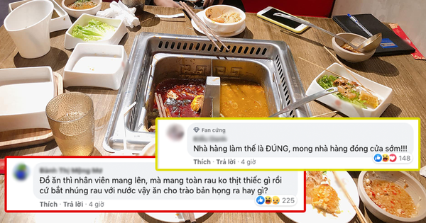 - H.Anh: “Mình từng đi ăn mấy chuỗi lẩu lớn, họ cũng note phạt như này luôn, nhưng họ bê lên món gì, mình không ưng, chưa nhúng, chưa đụng đũa thì báo trả bếp luôn vẫn oke ấy. Như chỗ rau này các bạn ấy còn chưa thả lẩu, hoàn toàn có thể trả lại được mà. Quan trọng là cách xử lý của quản lý ép người quá đáng quá”.