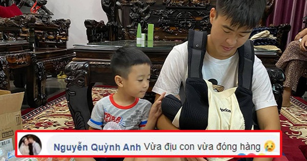 Trên Facebook cá nhân, Duy Mạnh chia sẻ bức ảnh anh chàng vừa địu con trai trước ngực, tay bận rộn gói những hộp mỹ phẩm. Anh chàng ngồi giữa đống hàng hóa của vợ, cúi đầu làm việc thực sự mang dáng vẻ của người đàn ông của gia đình, chăm chỉ lại dịu dàng thương yêu vợ con. Quỳnh Anh bình luận dưới bức ảnh như để mọi người hiểu hơn việc Duy Mạnh đang làm: "Vừa địu con vừa đóng hàng". Nàng WAGs còn kèm theo biểu tượng mặt buồn như thương và xót chồng lắm vậy.