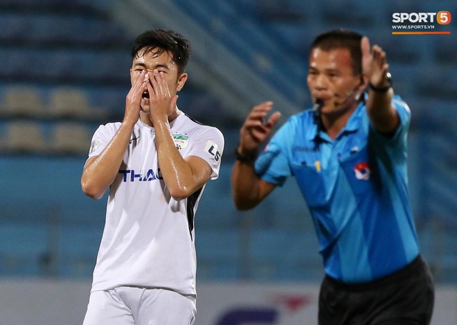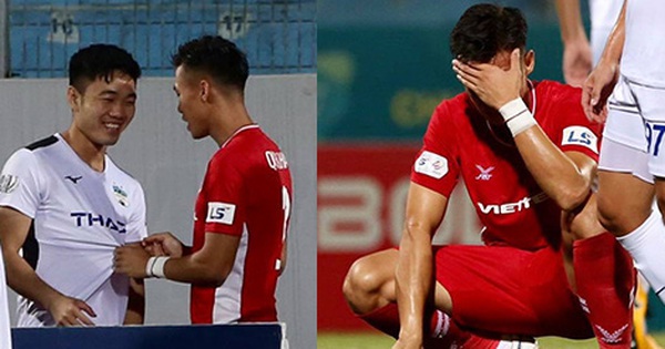 Nhưng bóng không trúng lưới mà bay thẳng vào mặt trung vệ Quế Ngọc Hải của CLB Viettel khiến anh chàng choáng váng