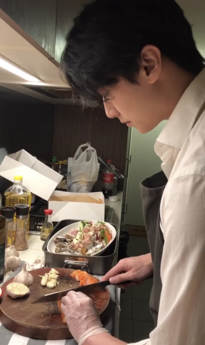Mới đây, Rocker tiếp tục xắn tay vào bếp để chuẩn bị cả một bàn tiệc ngon lành nhân kỉ niệm 1 năm yêu đương với nửa kia. Thực đơn của anh chàng có steak, hàu và cả cá hồi - nghe là đã thấy ngon lành và hấp dẫn rồi. Nhưng điều hấp dẫn nhất trong bếp không phải đồ ăn đâu mà chính là Rocker cơ!