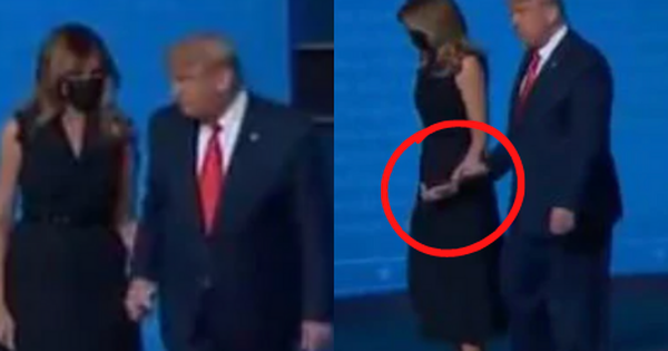 Đáng chú ý hơn, tại khoảnh khắc bà Melania Trump, như thường lệ xuất hiện trên sân khấu sau khi chồng kết thúc màn "so găng" nảy lửa cùng đối thủ, để chúc mừng ông cũng như vẫy chào tất cả khách mời, người xem nhanh chóng phát hiện được hành động khá kỳ cục của cặp đôi ngay trên sóng trực tiếp.