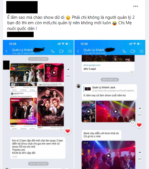 Mới đây, trên trang Facebook cá nhân của một bầu show, người này đã chia sẻ đoạn tin nhắn được cho là từ mẹ nuôi của K-ICM cùng dòng trạng thái khá "gắt": "Ế lắm sao mà chào show dữ vậy. Phải chị không là người quản lý 2 bạn đó thì em còn mời, chị quản lý nên không mời luôn. Chị mẹ nuôi quốc dân!".