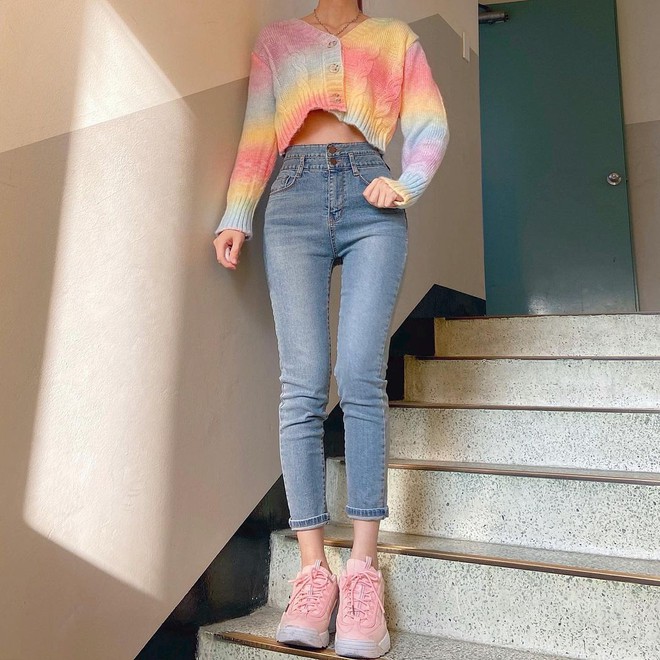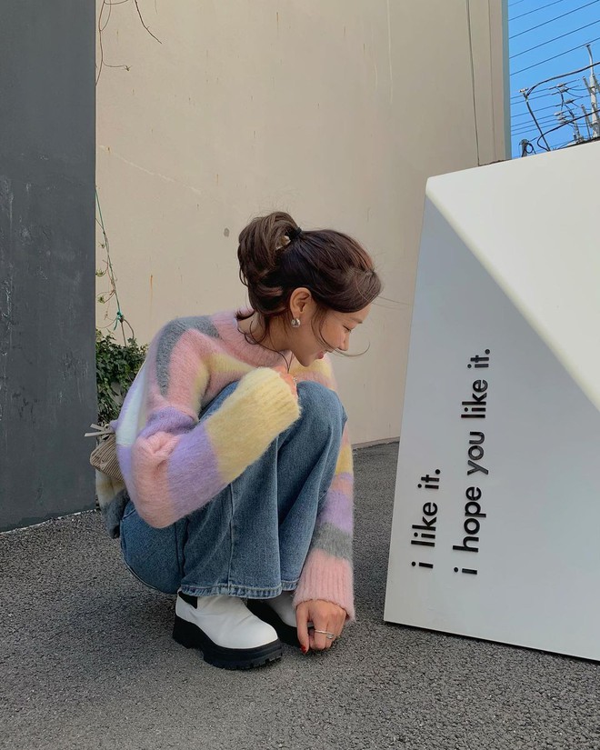 Đông này, các cô gái xứ kim chi còn lăng xê cả áo len loang màu, hoặc áo len có màu sắc sặc sỡ. Item này hoàn toàn có khả năng hô biến style của bạn nổi bật hơn, nhưng chúng không hề khó mix đồ như bạn tưởng. Vì những gì bạn cần là kết hợp em nó với quần jeans đơn giản hoặc chân váy xếp ly dịu dàng là "ok lah".