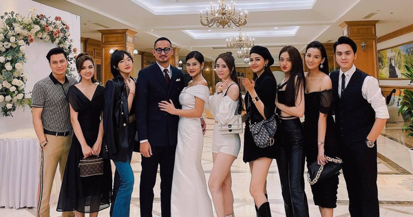 Dàn hot girl và diễn viên miền Bắc đến chung vui với tiệc mời cưới của MC Thu Hoài, từ trái sang: Việt Anh, Huyền Lizzie, Linh Sugar, ông xã và Thu Hoài, Quỳnh Nga, Phanh Lee, Thuỳ Anh, Lã Thanh Huyền và cuối cùng là MC Thái Dũng