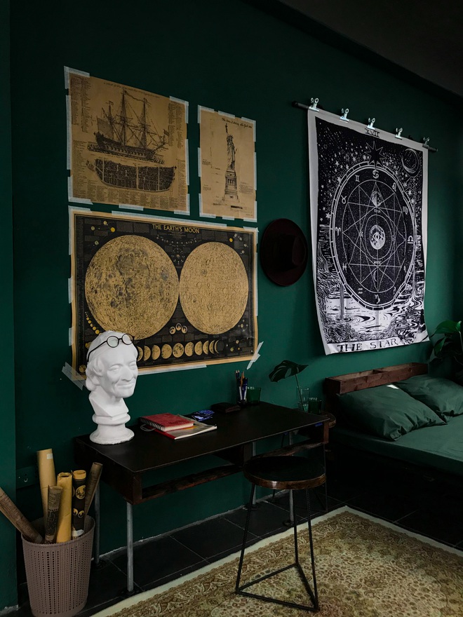 Lim tự làm tất cả đồ đạc như giường, bàn, giá treo đồ, dùng đa số là đồ tái chế hoặc mua ở chợ đồ cũ đem về sơn lại nên khoản tiền anh chi cho việc decor rơi vào khoảng 5 triệu đồng.
