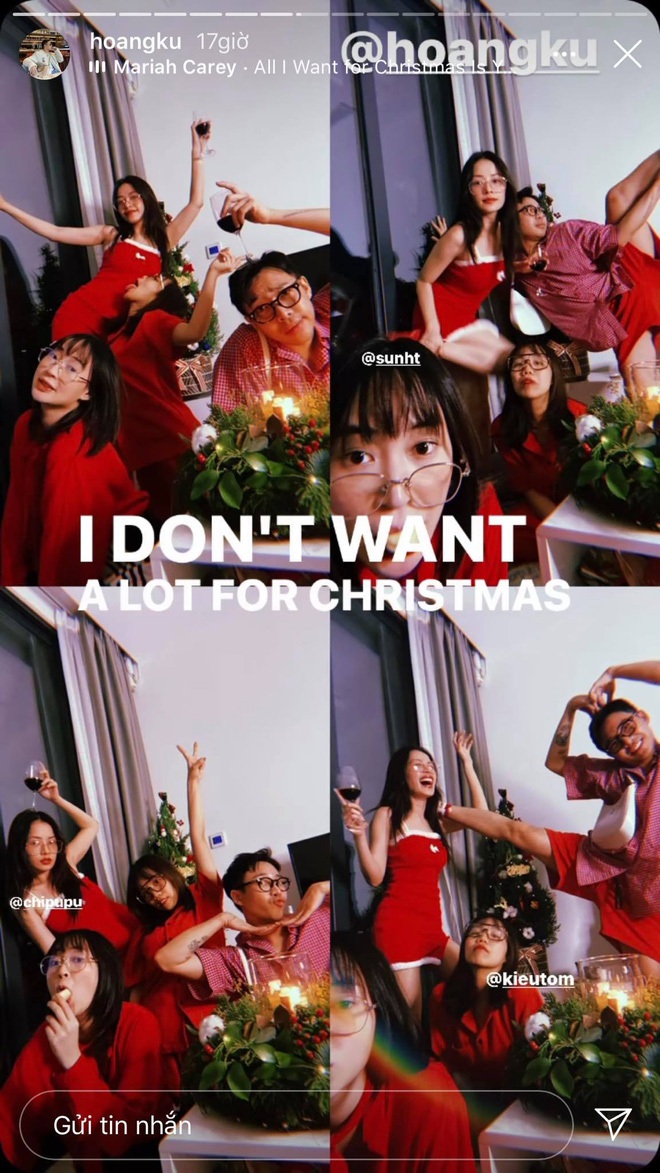 Trước đó, Chi Pu và hội bạn thân cùng nhau tổ chức quẩy bừng đón Giáng sinh, cả nhóm đã tụ tập với dresscode đỏ rực cho đúng không khí lễ hội. Năm nay ngoài việc vắng bóng Quỳnh Anh Shyn thì Salim cũng có kế hoạch khác nên không tham gia được.