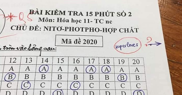 Mới đây, trên mạng chuyền tay nhau những bức ảnh về bài kiểm tra Hóa của một học sinh lớp 11. Theo đó có vẻ nữ sinh này làm bài khá tốt nên phần trả lời trắc nghiệm không bị gạch xóa nhiều. Thế nhưng điều gây chú ý là dòng chữ superloves chẳng hề có tẹo liên quan nào tới môn học mà cô bạn điền vào. Vì không hiểu học trò ám chỉ điều gì, để giải tỏa thắc mắc, thầy giáo liền vẽ mũi tên chỉ ra sau tờ bài làm và điều bất ngờ đã xảy ra.