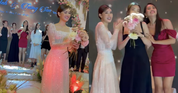 Theo đó, rất đông các nàng Hậu đứng xếp hàng phía sau, giang tay chờ bắt được "bó hoa tình yêu" từ Tường San. Và thật bất ngờ, nhân vật may mắn bắt được hoa trong đám cưới này chính là Hoa hậu Tiểu Vy. Thế nhưng sau đó, thay vì ôm hoa lên chụp hình kỉ niệm cùng cô dâu, Tiểu Vy lại vội vã chạy về phía Đỗ Mỹ Linh và dúi bó hoa vào tay đàn chị. Dường như, nàng Hậu sinh năm 2000 vẫn chưa muốn lấy chồng nên đành "nhường duyên" cho cô chị. Như vậy, Đỗ Mỹ Linh bỗng trở thành nhân vật nhận được hoa cưới. Trên MXH, netizen rần rần háo hức mong ngóng ngày cả 2 nàng Hậu đình đám Vbiz báo "tin hỷ" trong tương lai.