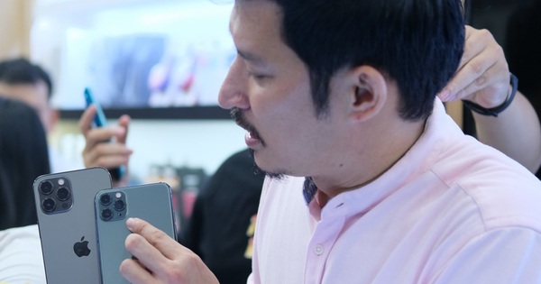 Diễn viên Huy Khánh đang cầm trên tay những chiếc iPhone 12 vào ngày đầu máy mở bán tại Việt Nam. (Ảnh: Hải Đăng)