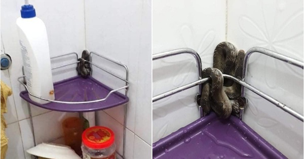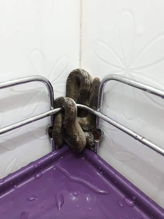 Theo người đăng tải hình ảnh kể lại, cô gái ở trọ chung cùng người bạn nữ, đang tắm thì sực nhớ quên khăn nên quờ tay tìm kiếm. Ai ngờ khi lùa tay qua kệ inox để xà phòng, cô nàng chạm tay trúng con rắn đang bám chặt ở góc nên giật mình hoảng hốt, vội vã chạy thoát thân ra phòng ngoài dù trời miền Bắc đang cực lạnh.