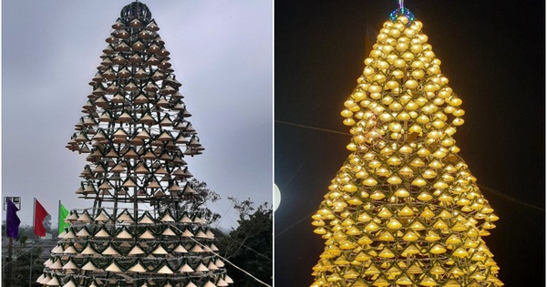 Cây thông cao 18 mét, đường kính tán dưới cùng lên đến 8 mét với tổng trọng lượng hơn 2 tấn được tạo nên từ 1.000 chiếc nón lá có gắn bóng đèn và quả cầu trang trí