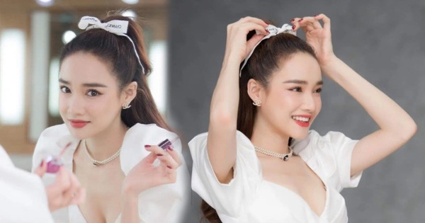 Bã xã Trường Giang lấy dây ruy băng Chanel buộc như dây buộc tóc trẻ trung, cô còn đeo vòng cổ choker và khuyên tai Chanel thời thượng