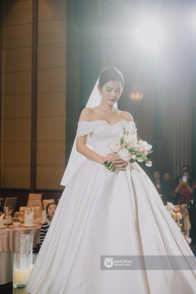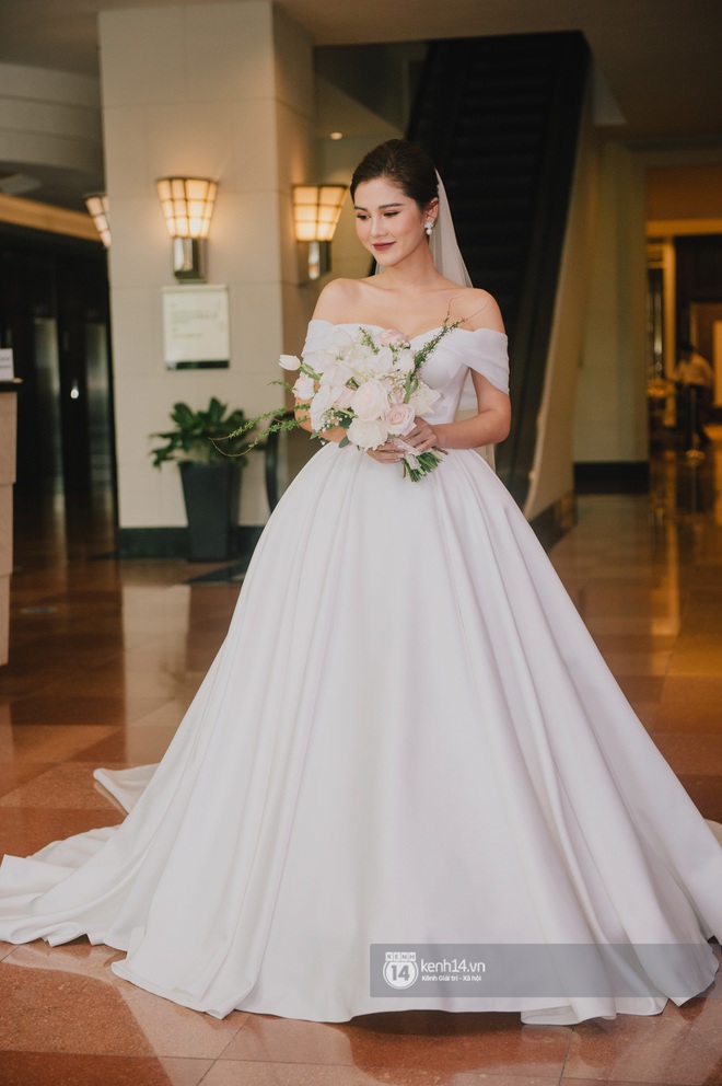 Xuất hiện trong ngày trọng đại, MC Thu Hoài tiếp tục giữ vững phong độ nhan sắc khiến ai nấy đều phải trầm trồ. Vốn đã thuộc hội mỹ nhân hàng đầu, khoác lên mình tà váy cưới trắng, trông cô nàng lại càng rạng rỡ, nổi bật hơn. Cộng thêm nụ cười không thể tươi hơn thể hiện sự hạnh phúc vì lấy được chồng, không còn nghi ngờ gì khi nói MC Thu Hoài đúng là cô dâu xinh đẹp nhất.