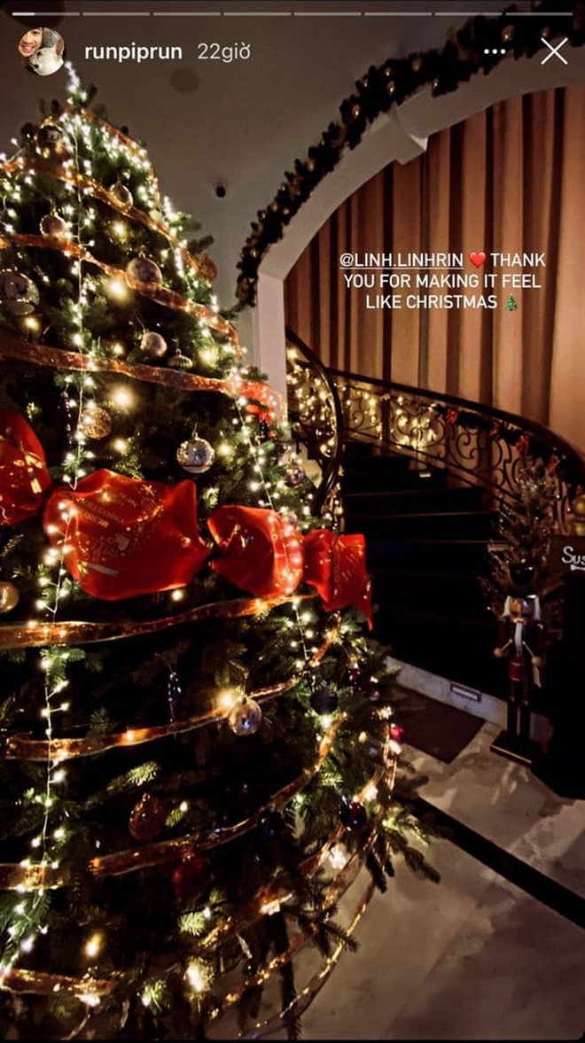 Đặc biệt, thiếu gia còn đăng story cảm ơn bạn gái khi tự tay trang hoàng nhà cửa và cây thông. Đó là một cây thông rực đèn, cao lớn đến mức chạm trần nhà. Về phần mình, Linh Rin cũng check-in cạnh cây thông trong trang phục ở nhà thoải mái. Nhìn thôi cũng biết cô nàng tự hào về thành quả của mình ra sao.