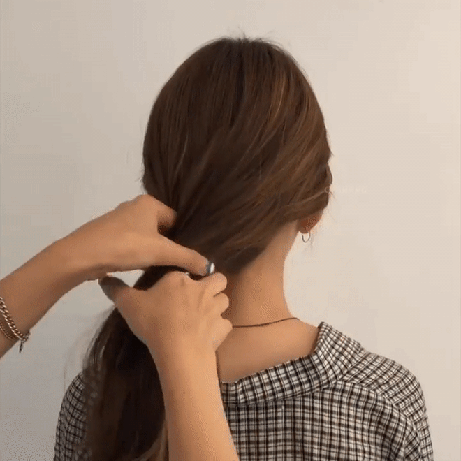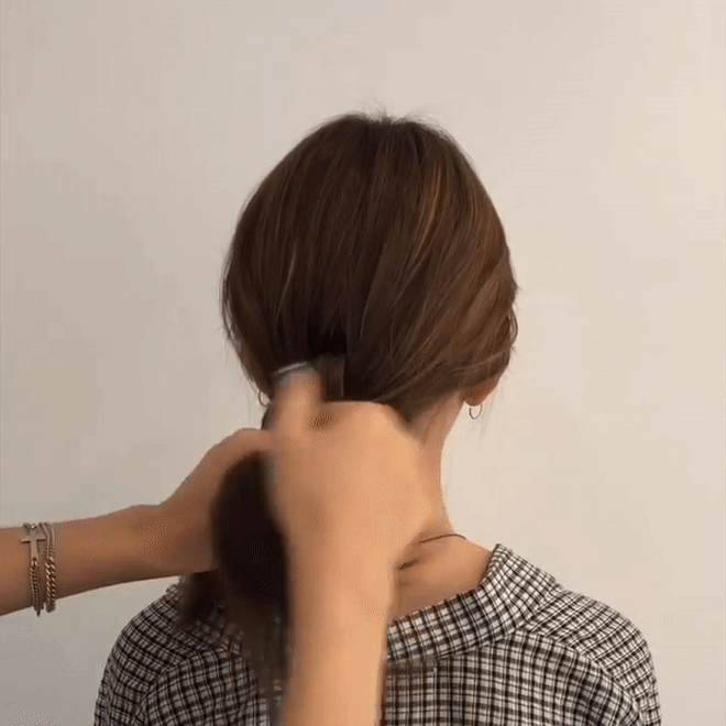 Cuối cùng là buộc gọn phần đuôi và cũng xoắn ngược mối tóc lên trên, cố định bằng chun hoặc kẹp tăm là được.