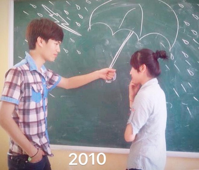 Được biết Mai và chồng mình quen nhau từ khi lên cấp 3 do học cùng lớp. Hồi đó còn ngô ngố, ai biết yêu đương gì đâu chỉ thấy thinh thích nhau, hay theo lời Mai chính là "thân nhau theo kiểu trên tình bạn dưới tình yêu". Lên lớp 11, có điện thoại cục gạch để nhắn tin, mối quan hệ của cả hai mới dần tiến triển hơn. Vào ngày 1/4 năm đó, Thiệu tỏ tình với Mai và cả hai bắt đầu mối tình 10 năm. Bức ảnh đính kèm bài viết cũng được chụp vào thời điểm ấy, và do chụp bằng máy ảnh kĩ thuật số nên mới có thể giữ đến hiện tại.