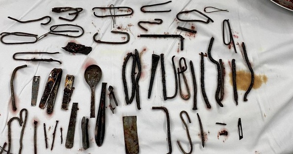 Khi vào ổ bụng thấy dạ dày sa thấp, viêm dày bên trong có khoảng 1kg dị vật kim loại dã bị ăn mòn một phần như đinh, thìa, bấm móng nay, lưỡi dao, thỏi sắt, móc đồ..., bệnh nhân đã được lấy tất cả các dị vật ra ngoài, diễn biến sau phẫu thuật ổn định.