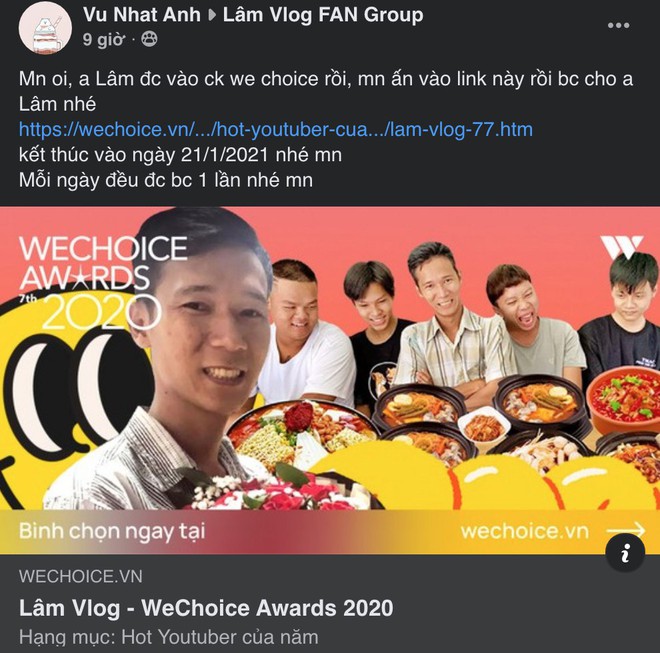 Đứng đầu danh sách nhiệt tình trong khoản kêu gọi vote có lẽ phải kể đến Lâm Vlog. Từng nhận số vote cao nhất trong giai đoạn gửi đề cử, Lâm Vlog tiếp tục giữ phong độ khi cổng bình chọn chính thức được mở