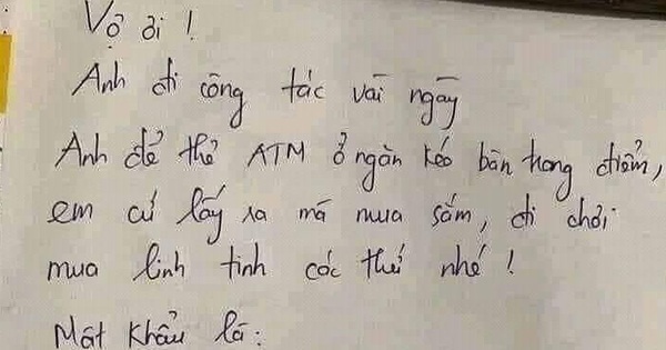 Mới đây, dân mạng được phen té ngửa với một pha thử thách của người chồng dành cho vợ mình trước khi đi công tác. Anh để lại mẩu giấy với lời nhắn: Anh đi công tác vài ngày, anh để thẻ ATM ở ngăn kéo bàn trang điểm, em cứ lấy ra mua sắm, đi chơi, mua linh tinh các thứ nhé. Mật khẩu là.. một bài toán.