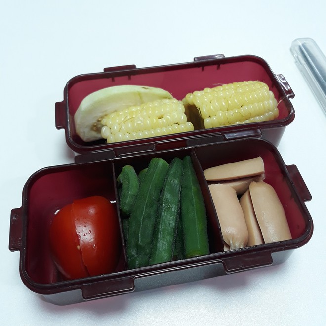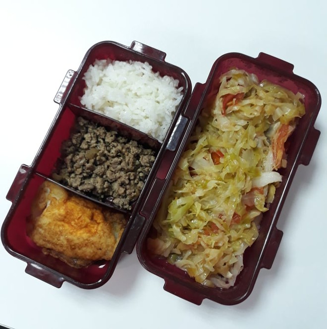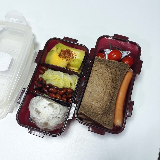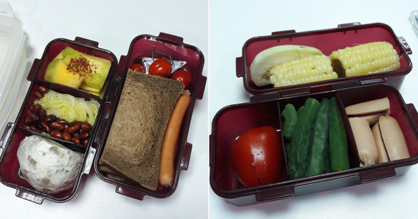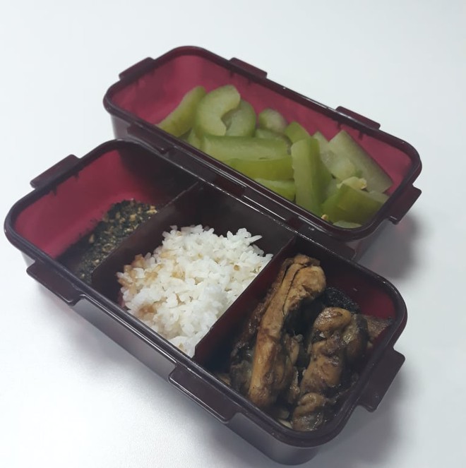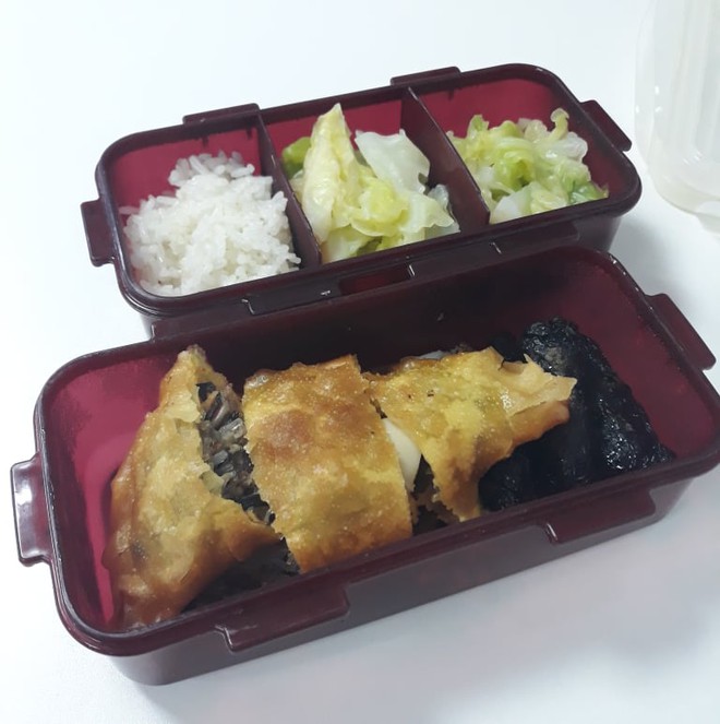 Lúc đầu trông hộp cơm khá buồn cười vì bố mình cho cơm trắng, thịt gà trắng, nấm cũng trắng nốt. Về sau thì bố bắt đầu thích bày biện màu sắc hơn. Còn mình thì có gì mình cũng ăn dù một số cái mình không thích lắm như khoai lang với xúc xích nhưng vẫn ăn vì nhà có rất nhiều".