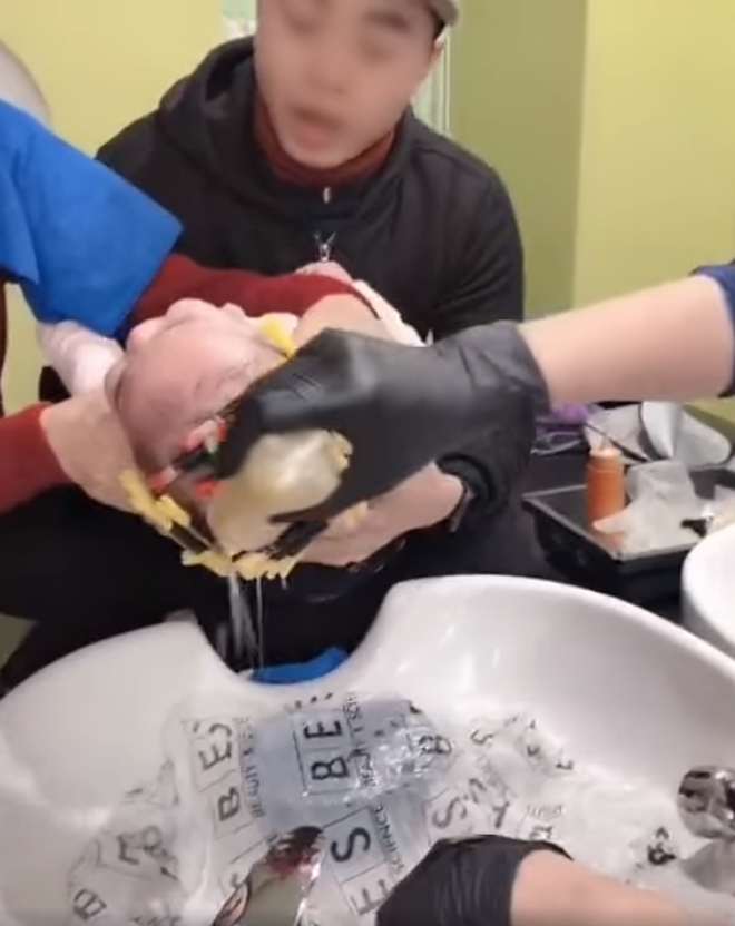 Theo nội dung đoạn clip, bé gái bị cuốn tóc vào hàng chục ống nhựa thít chặt đến sát da đầu. Bé bị bà và một người đàn ông bế ngửa trên ghế gội đầu, giữ chặt chân tay để cho nữ nhân viên đổ hóa chất làm tóc từ chai nhựa lên đầu bé.