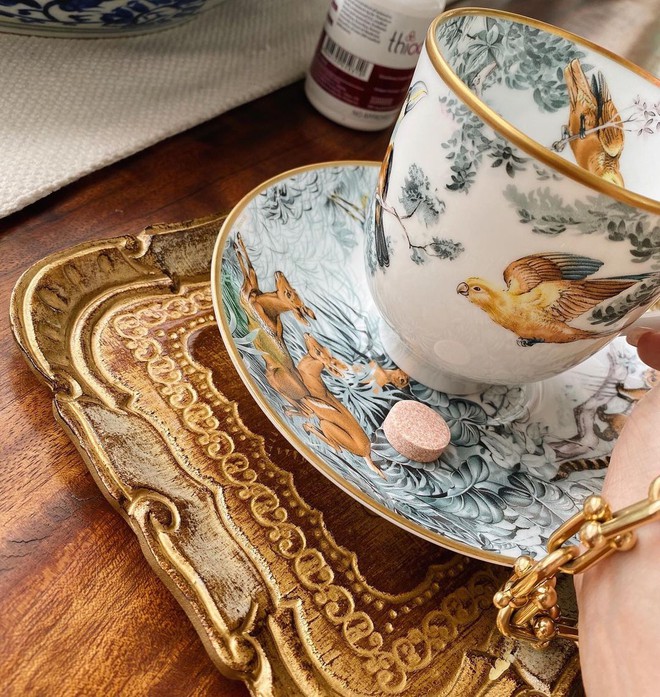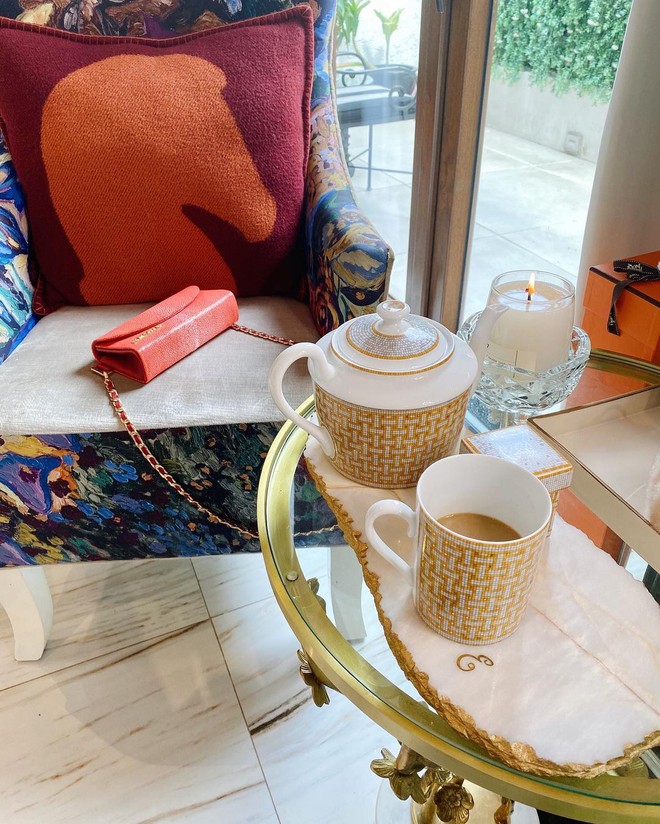 Bộ đồ ăn bằng vàng 24k đắt đỏ của Hermès. Trong những bức ảnh đã đăng tải, Heart Evangelista sở hữu ít nhất 6 item là: tách và đĩa cafe (6,2 triệu), đĩa ăn tối (5,8 triệu), ấm (17 triệu) và cốc (3,2 triệu)