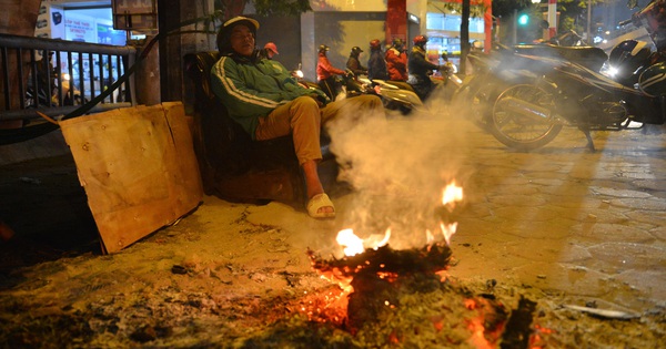 Nền nhiệt giảm mạnh dưới 10 độ C, nhiều người dân lao động đốt lửa dọc vỉa hè. (Ảnh: Đinh Huy)