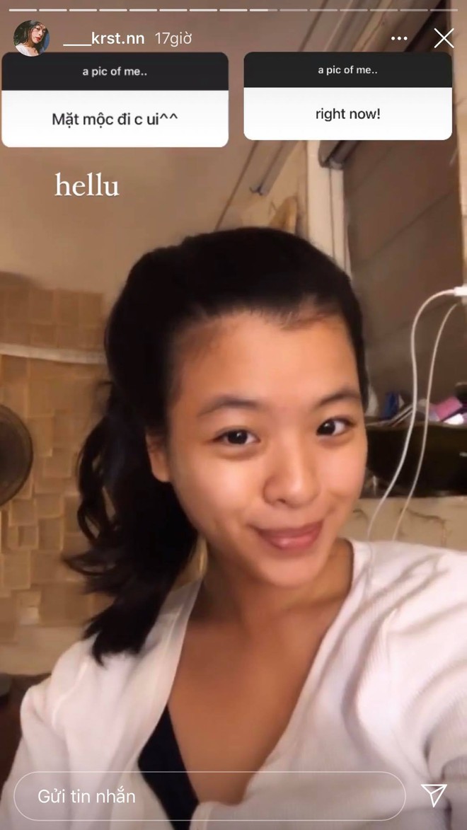 Nhưng nhiều không đồng nghĩa với tất cả khi ngày càng nhiều cô nàng tự tin khoe mặt mộc nét nào ra nét nấy. Một trong số đó là Hồng Khanh - con gái út NSƯT Chiều Xuân. Mới đây, cô bạn lại thêm một lần để mặt mộc hoàn toàn và dùng camera thường theo yêu cầu của dân mạng, hoàn toàn trái ngược với style make up đậm đà vốn có.