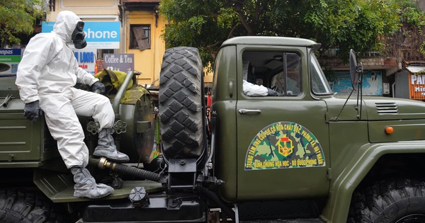 Binh chủng Hoá Học, Bộ Quốc phòng phun khử khuẩn phố Trúc Bạch ngay khi Hà Nội ghi nhận bệnh nhân 17. (Ảnh: Phương Thảo)