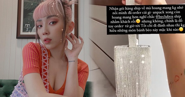 Chẳng là Tóc Tiên đã đặt một chiếc túi lấp lánh rất điệu đà. Nhưng đó chắc là chuyện của vài tháng trước rồi. Bởi mới đây khi nhận hàng, nữ ca sĩ lập tức hoang mang không nhớ đã đặt món gì luôn ấy chứ! Tưởng đâu đập hộp xong rồi sẽ làm Tóc Tiên nhớ ra mọi chuyện. Nhưng không, bà xã Hoàng Touliver tiếp tục hoang mang, chưng hửng vì nghĩ rằng shop đã gửi nhầm hàng của khách khác cho mình.