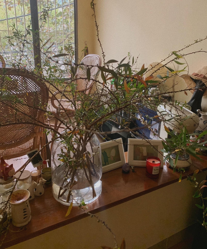 Tuyết mai rừng khi mới mua trông sẽ khá giống... bó củi khô. Vì thế, để giao diện đỡ chán đời, cô đã cắm thêm chút lá tuyết mai hoặc bất kì loại lá nhỏ xinh nào vào cũng được.